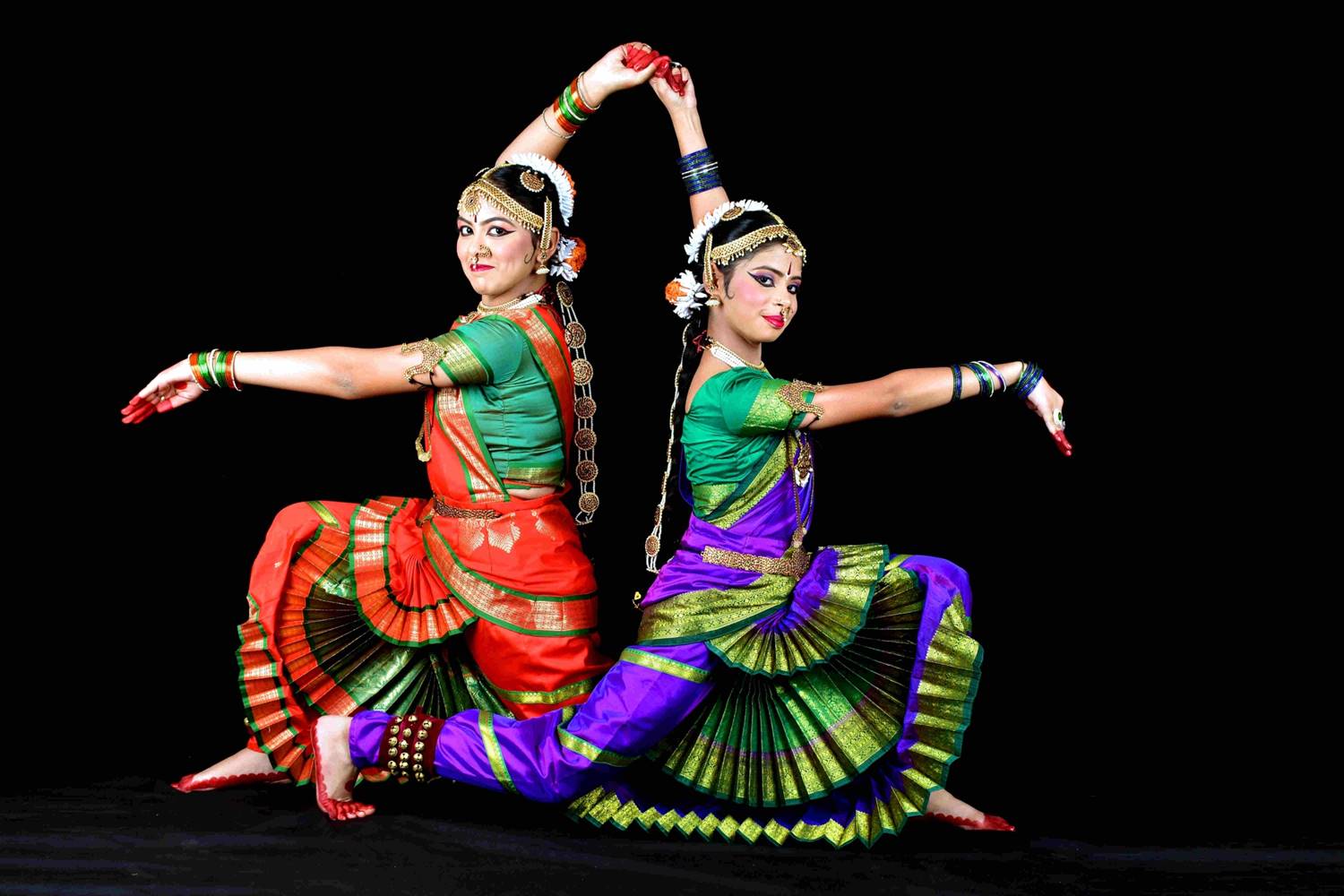 Bharatanatyam style is noted for its fixed upper torso, legs bent or knees flexed out combined with spectacular footwork, a sophisticated vocabulary of sign language based on gestures of hands, eyes and face muscles. The dance is accompanied by music and a singer, and typically her guru is present as the director and conductor of the performance. The dance has traditionally been a form of an interpretive narration of mythical legends and spiritual ideas from the Hindu texts. The performance repertoire of Bharatanatyam, like other classical dances, includes nrita (pure dance), nritya (solo expressive dance) and natya (group dramatic dance).